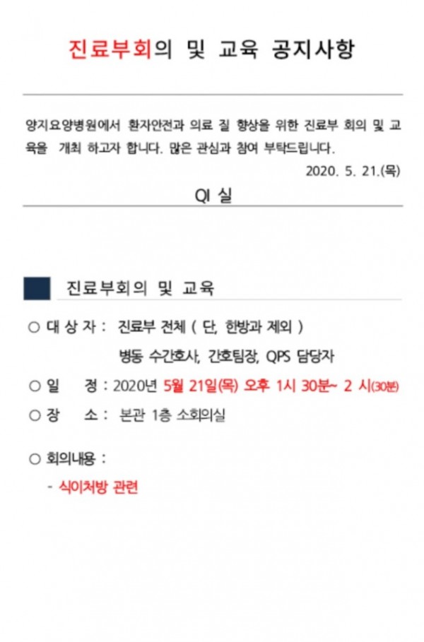 환자안전과 의료 질 향상을 위한 진료부 회의 및 교육을 실시합니다.