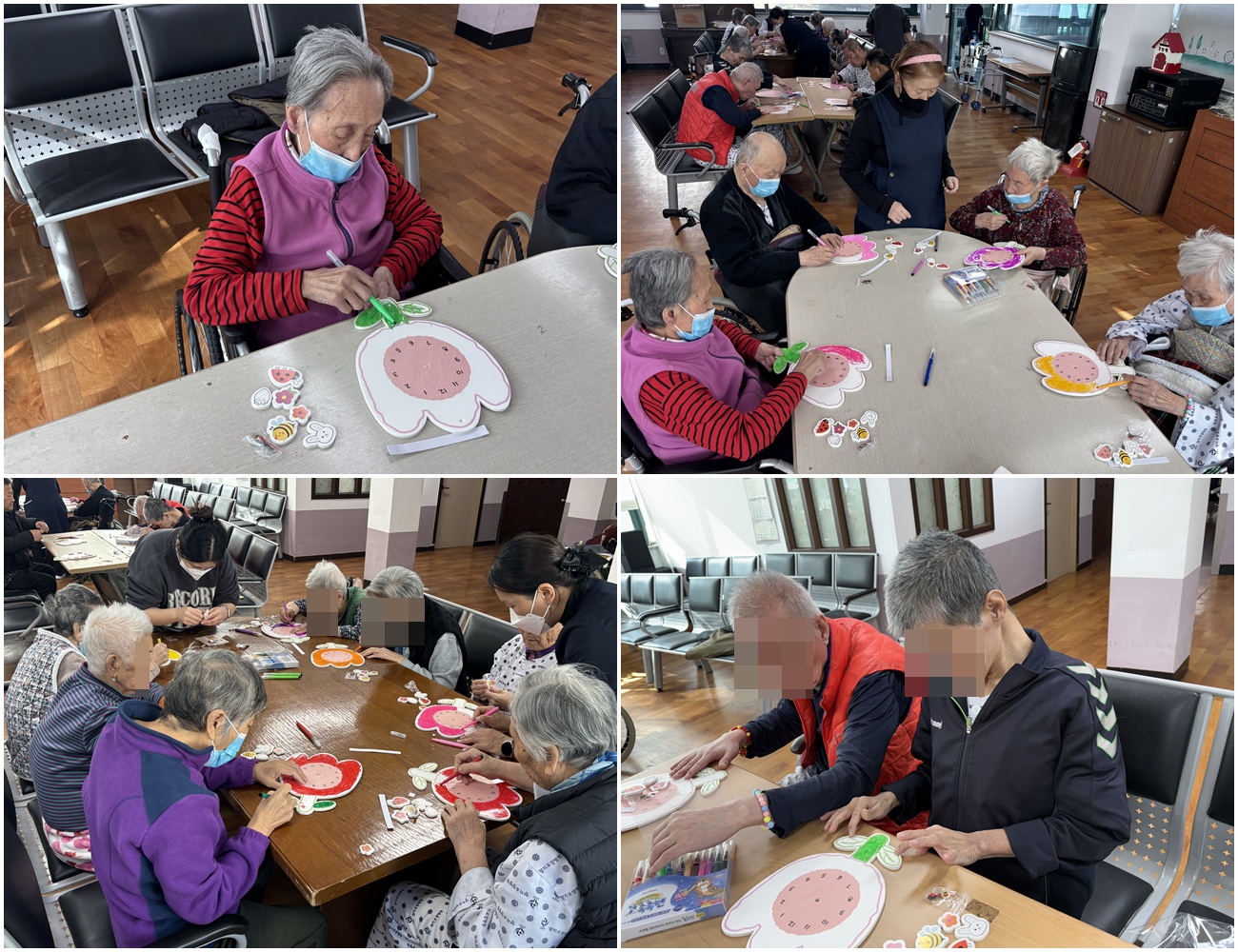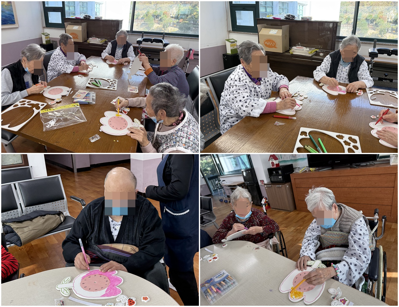 시계 도안에 시침, 분침, 초침을 꼽기 위해 함께 시간을 확인하며 인지기능향상에도 도움을 줄 수 있었습니다.