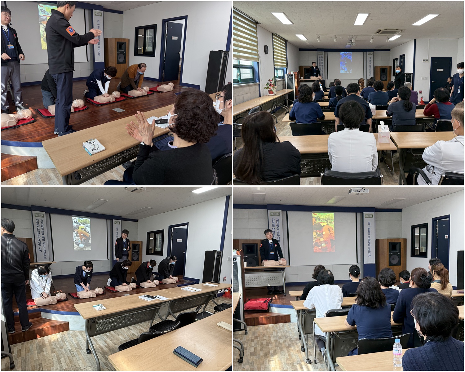 이번 교육은 실제 응급 상황을 가정하여 심정지 환자 발생 시 초기 대응 방법과 심폐소생술 시행 절차를 중심으로 이루어졌습니다.