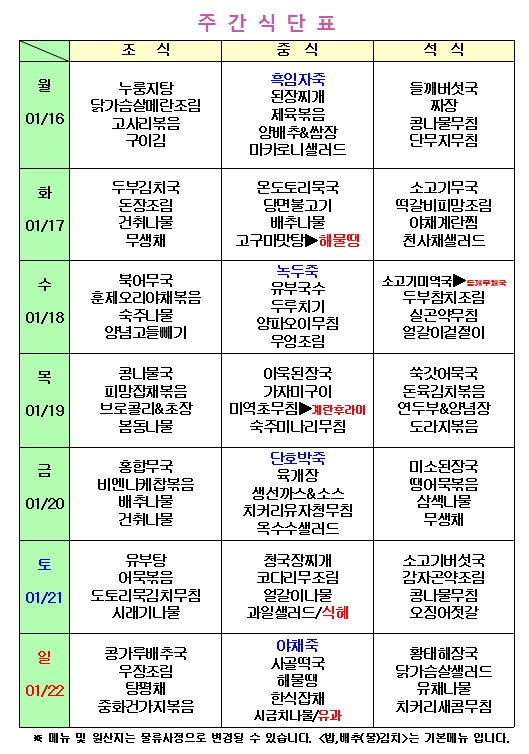 주간식단표(1/16~1/22)