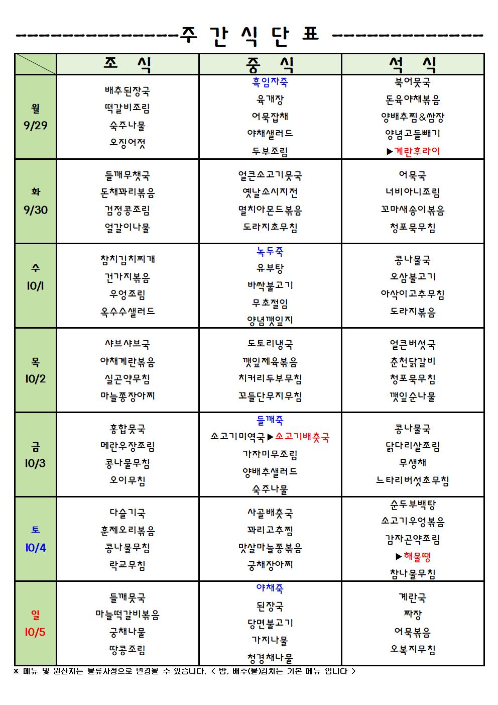 9/29-10/5 주간식단표