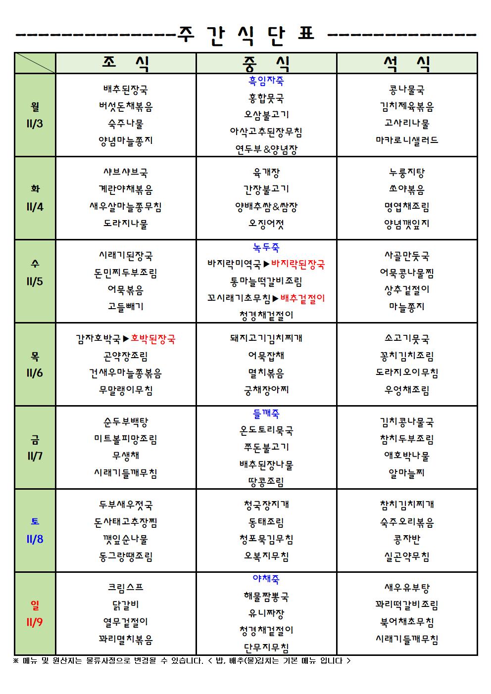 11/3-11-9 주간식단표