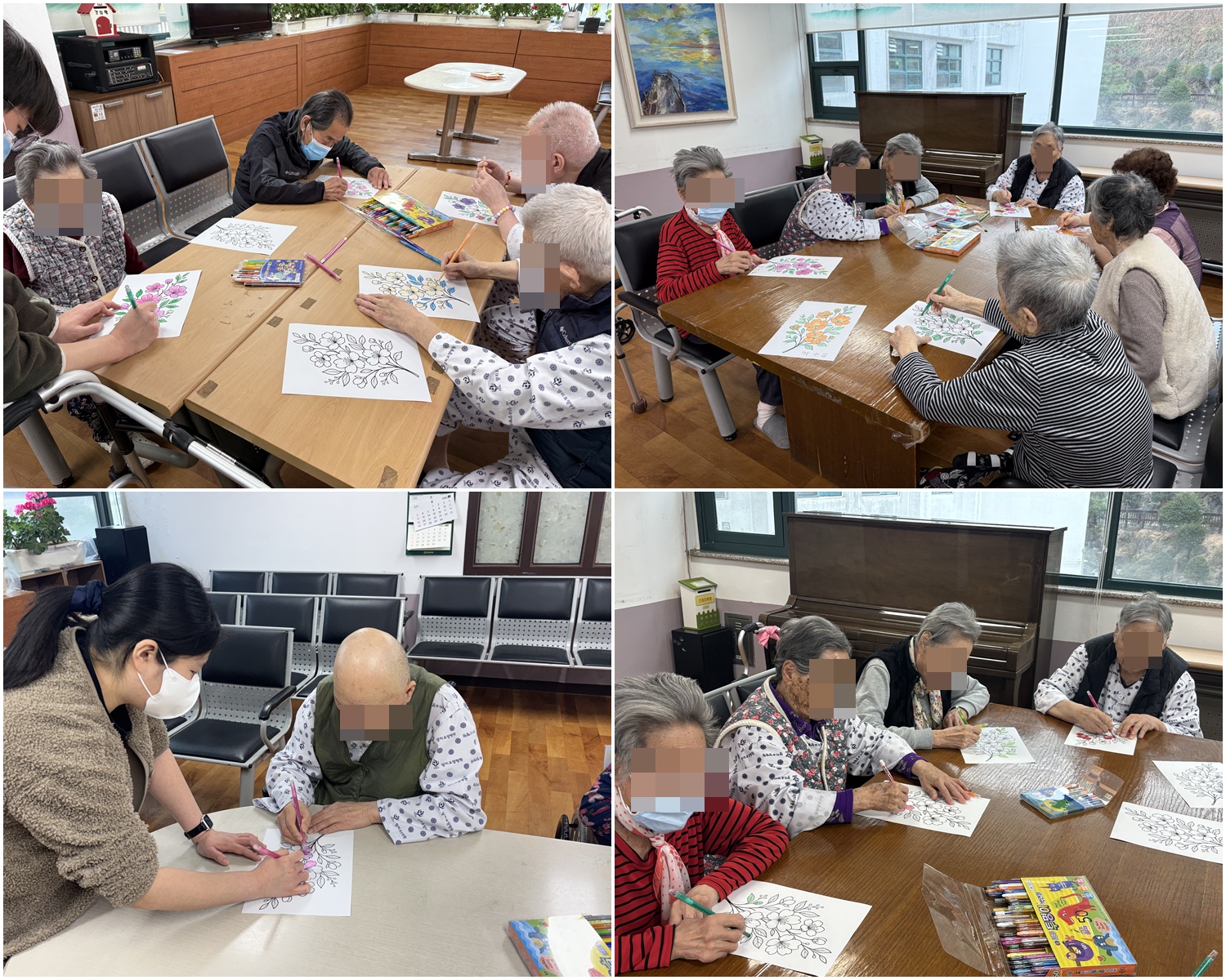 금일 환자분들의 정서 안정과 인지 자극을 위해 벚꽃 색칠하기 프로그램을 진행하였습니다.