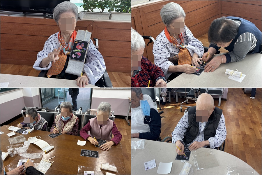 금일 요양원에서는 스크래치 페이퍼 문자도 족자 만들기 프로그램을 진행하였습니다.